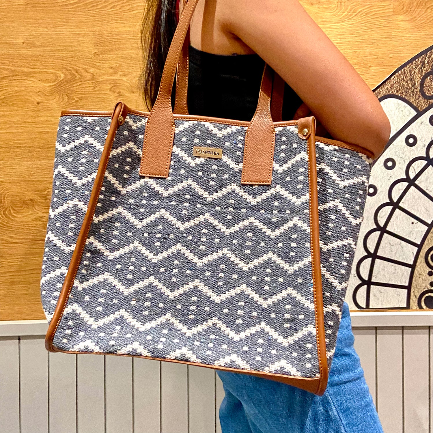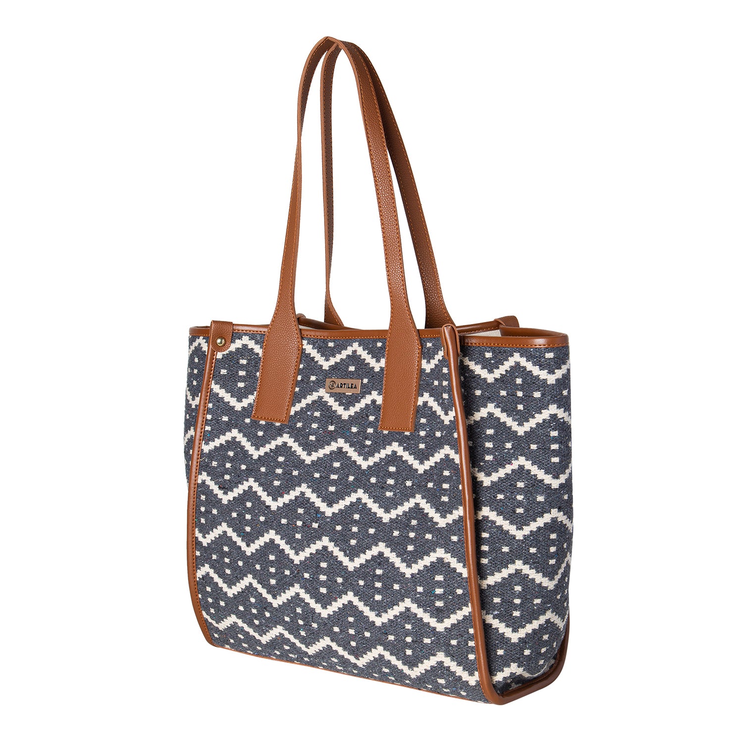 Ikat tote bag with magnetic closure and an open pocket inside.